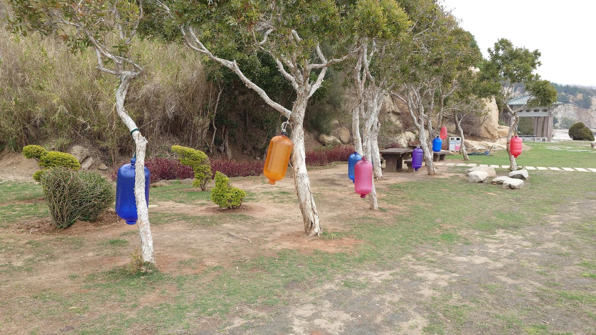 每個樹上掛著五顏六色桶  不太確定是裝飾還是別有用途
